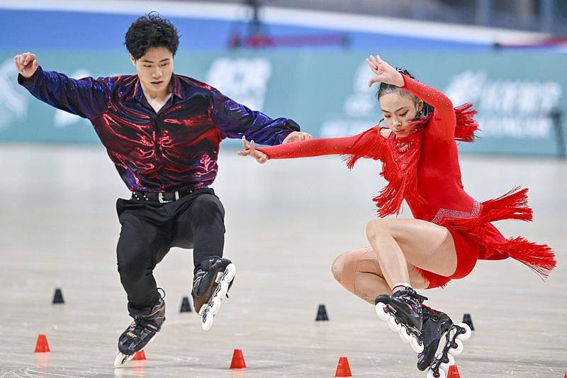 △2023年10月4日,杭州第十九届亚运会混合自由式轮滑男女双人花式绕桩决赛。中国组合张颢(左)、朱思怡获得金牌。